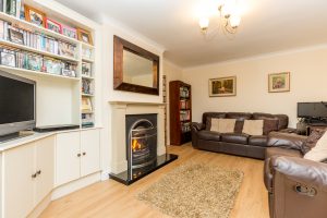 Living room 4.6m x 3.6m Oak flooring, feature fireplace, custom tv cabinet, coving.